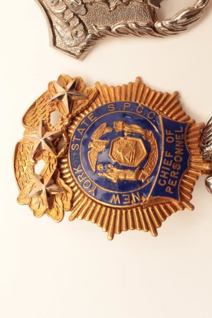 Lot of 4 badges including a New York State S.P.C.C. Chief of Personnel cap badge, a New York City Transportation Police Deputy Inspector cap badge, a City of New York Police #13318 cap badge and a City of New York Dept. of Juvenile Justice Juvenile Counselor pin shield badge (hallmark Blackinton). Est.: $200-$400.