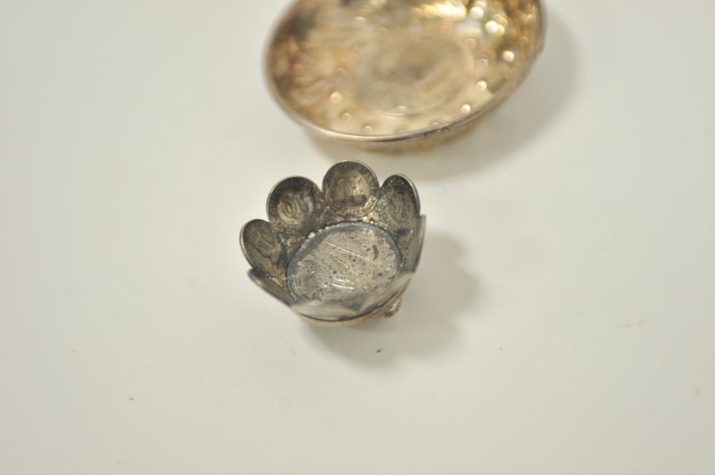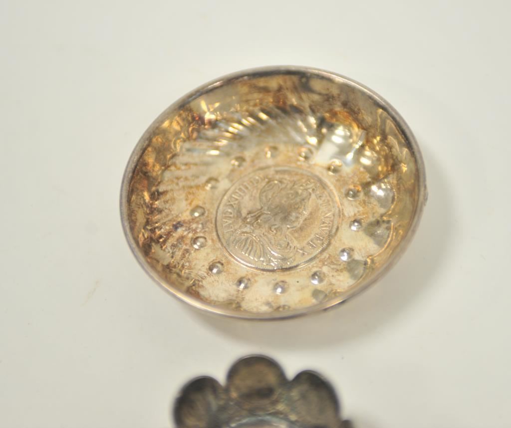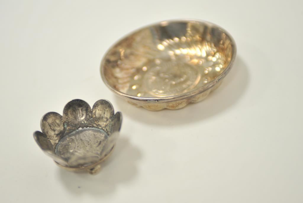 Two small display dishes made from old silver coins, one is approximately 3.5” in diameter, the other 2” in diameter. Est.: $100-$300.