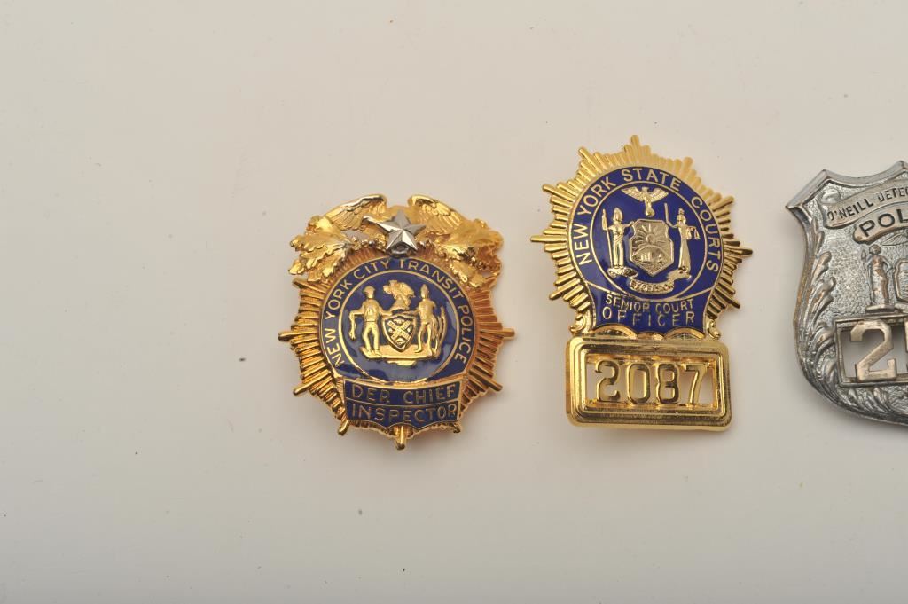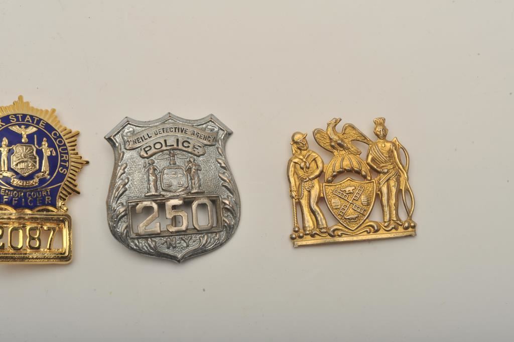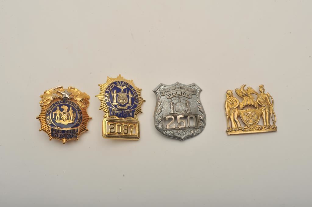 Lot of 4 badges including a New York City Transit Police Dep. Chief Inspector cap badge, a New York State Courts Senior Court Officer cap badge #2087, an O’Neill Detective Agency Police (New York) pin shield badge #250 and an unmarked cap badge displaying a sailor, an Indian and an eagle over shield. Est.: $200-$400.