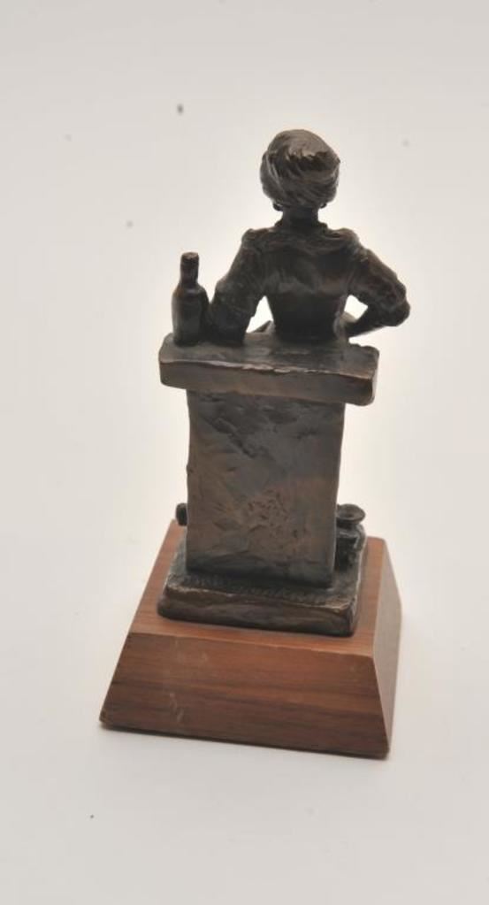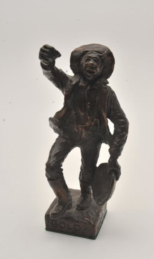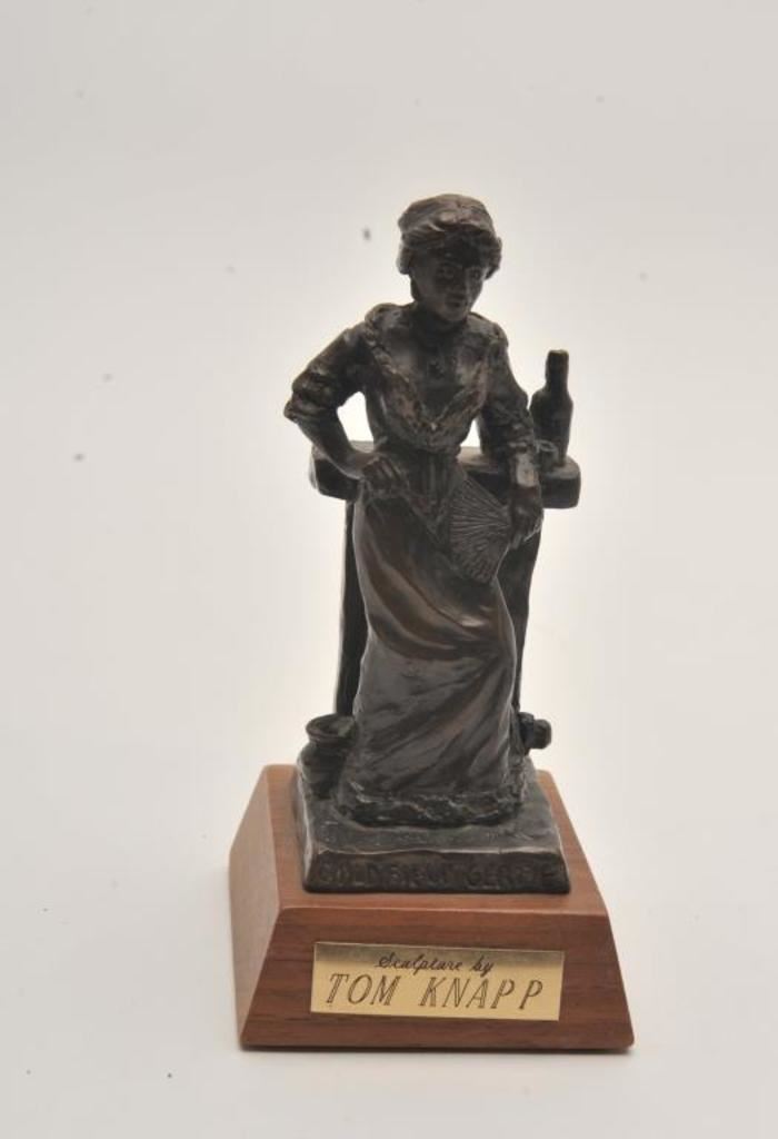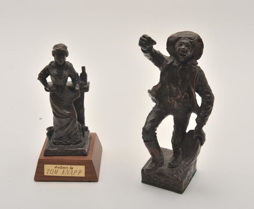 Bronze entitled “Gold” by Tom Knapp by Arrowsmith, Santa Fe, N.M. along with “Gold Field Girl” bronze; 2 total; 1 approximately 3.25” x 3.25” x 6.75”; the other approximately 2.375” x 2.375” x 5.75”. From the estate of Elmer E. Taylor. Est.: $150-$300.