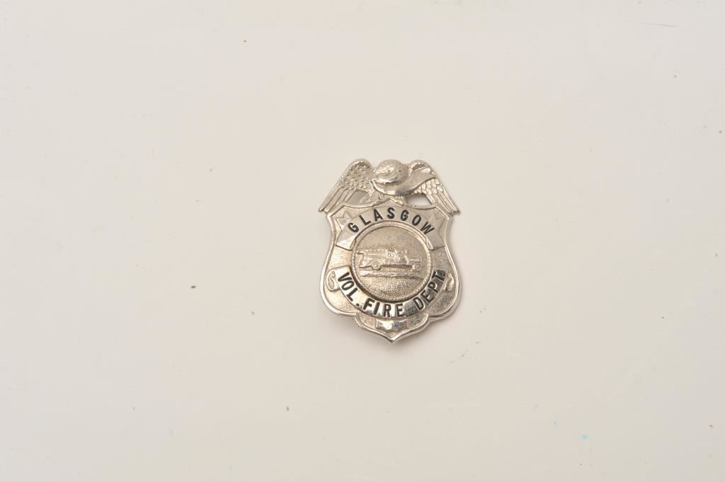 Glasgow Vol. Fire Dept. badge with “Pat. 2066969” on base of pin. Est.: $100-$200.