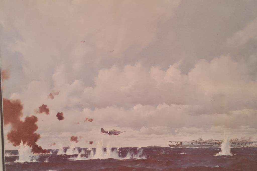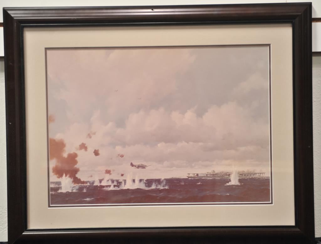 Large framed and matted color print of a U.S. TBM plane in action flying toward a carrier; approximately 22” x 27” overall. From the Bill Bettis Nieuport 17 Restaurant collection. Est.: $75-$125.