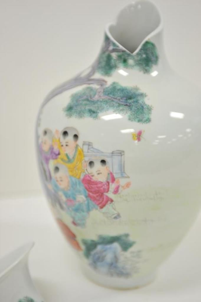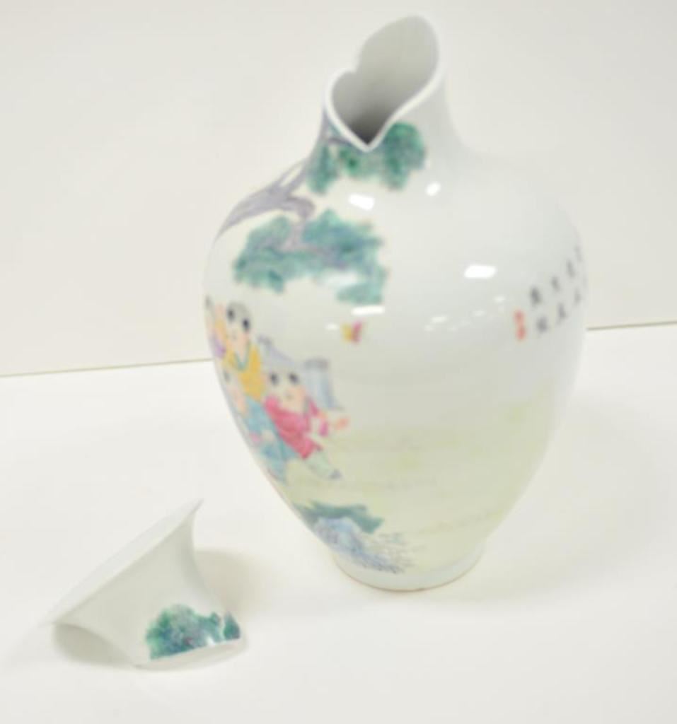Chinese porcelain vase with painted children scenes, approximately 9” in diameter and 13” in height; neck has been broken from body of vase but is included and may be repairable. Est.: $50-$75.