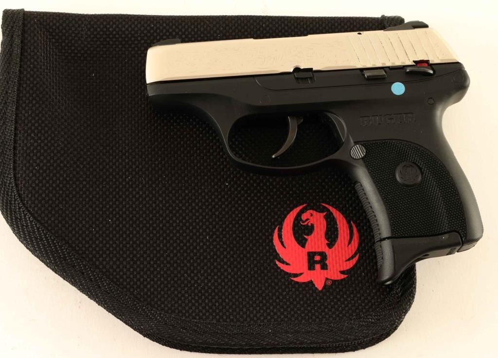 Semi-automatic pistol. 100% Nickel plated slide, with black synthetic frame/grips. 3' barrel. bore is excellent/bright. Action is tight. Slide is etched with a floral pattern, with the Ruger eagle in a circle. Gun appears in an almost new condition, with no visible marks/scratches. come in the original white Ruger box, with paperwork Ruger lock, and black nylon Ruger case. A very nice looking pistol, with the etching. NRA Condition-Excellent. Modern Firearm