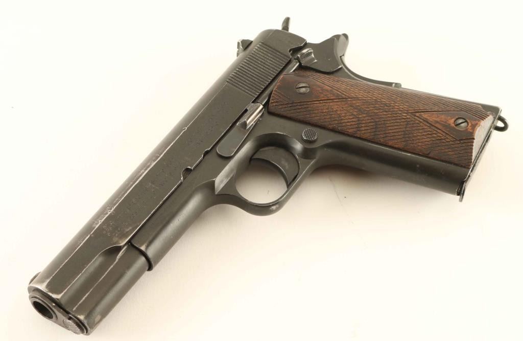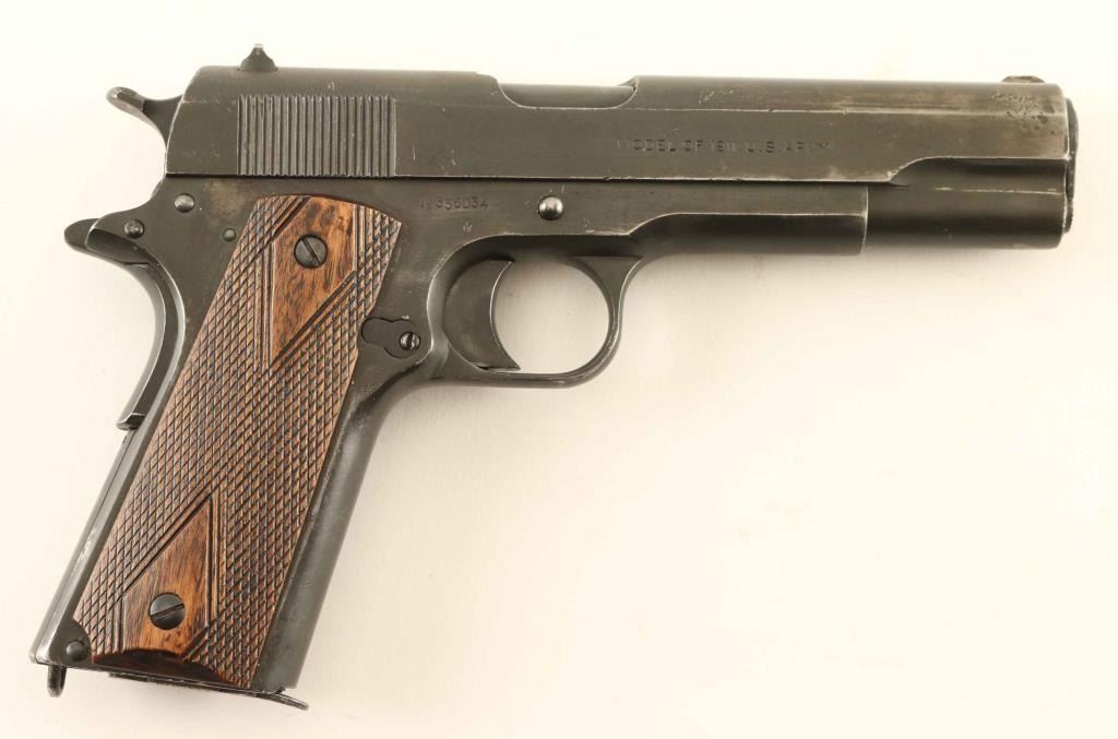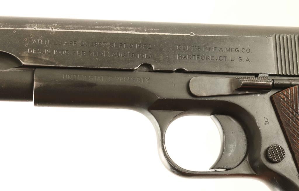 WWI era U.S. military contracted single action semi-automatic service pistol chambered in .45 Auto, manufactured circa 1918. Features a blued finish, 5" barrel, low profile round blade front sight(has been slightly modified), dovetailed rear sight with square notch, smooth trigger, knurled wide hammer spur. thumb safety on the left side of the framer, grip safety, push button magazine release, 7 round magazine, smooth straight main spring housing with lanyard loop, and two-piece diamond checkered wood grips. Markings: Slide - "PATENTED APR.20,1897. SEPT.9,1902/DEC.19,1905. FEB.14,1911. AUG.19,1913", "COLT'S PT. F.A. MFG. CO./HARTFORD, CT. U.S.A,", [rampant colt], "G", "H" & "MODEL OF 1911. U.S. ARMY". Frame - "UNITED STATES PROPERTY", [Eagle Head]/"S14", "7", "8", "H", "G", "A" & "No 356034". Barrel: "HS" & "P" and Magazine - "19200-/ASSY 5508694/MFR. 1M291". Pistol exhibits approximately 80% of it's thinned blued finish showing holster/edge wear with some dings and the majority of the metal surfaces displaying a smooth dark grey appearance. Action is strong, the bore is excellent, markings are good with a faint Rampant Colt, and the wood grips are good as worn semi-smooth. Condition is Very Good. ***C&R Firearm***