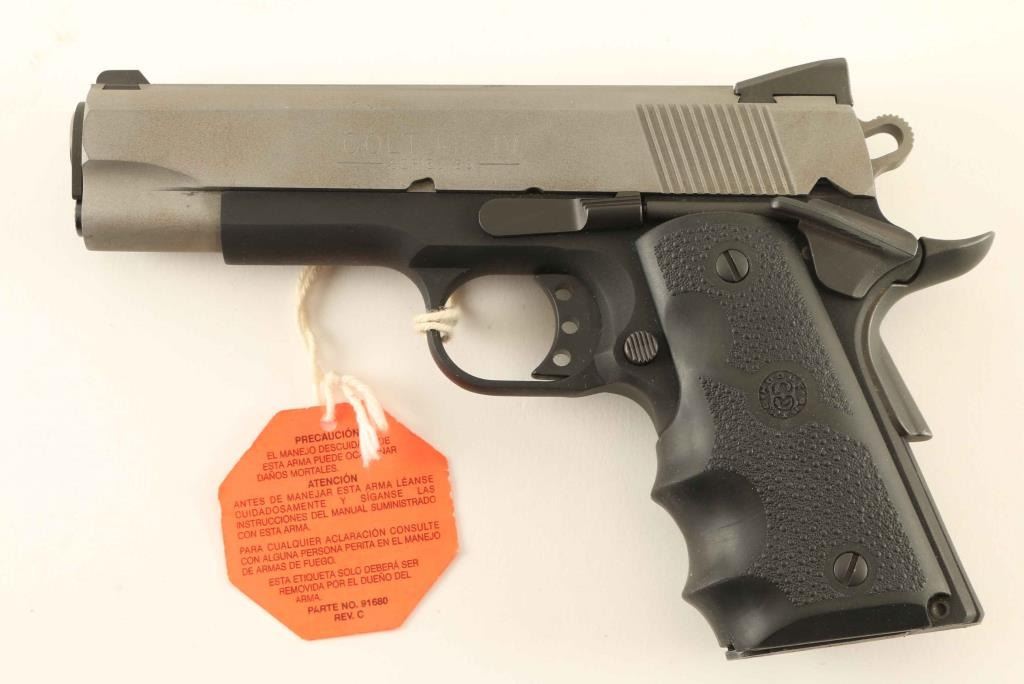 'Concealed Carry Officers, MK IV Series 80' Compact, lightweight 1911A1 platform single action semi-automatic pistol chambered in .45 Auto, manufactured circa 1998. Features a matte silver finished slide, 4.25" barrel, dovetailed front sight with white dot, drift adjustable two-dot rear sight with set screw, smooth trigger, skeletonized hammer with serrated round spur, thumb safety on the left side of the frame, upswept grip safety, serrated flat mainspring housing, push button magazine release, factory 7 round magazine, and one-piece Hogue pebbled black rubber wrap-around finger groove grip. Includes the original factory hard case with documents and spare magazine. Pistol exhibits very little wear with only a few minor handling marks observed. Action is smooth, the bore is excellent and the rubber grip is fine. Condition is like NRA Perfect in case. ***Modern Firearm***