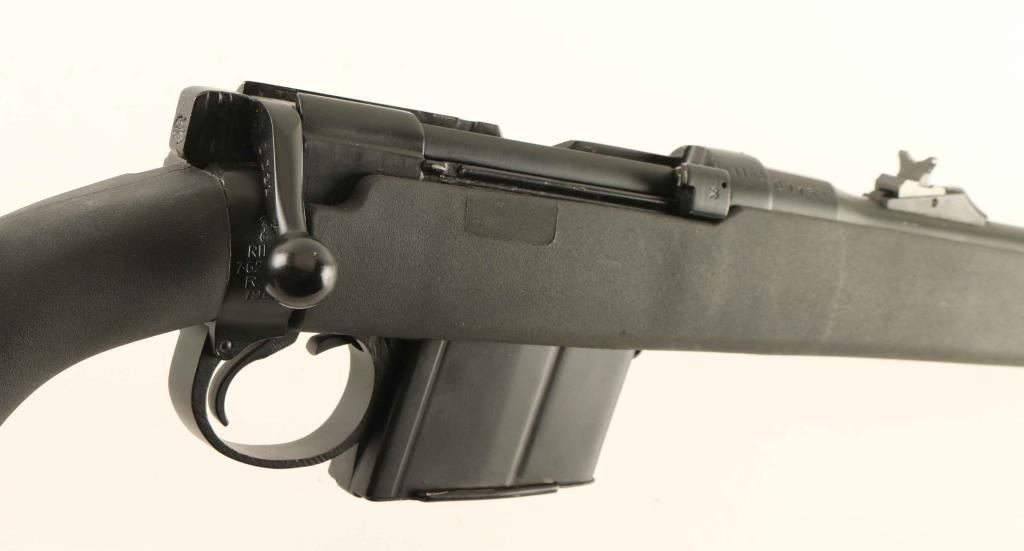 Bolt action rifle. Sporterized British military rifle. Black-matte finish,with two piece dark gray Ram-line synthetic stock. Recoil pad and sling swivel studs attached. 20 1/2' barrel. Bore is good, but dirty. Action locks up tight. Chamber ramp has some pitting. Overall a very nice conditioned rifle, except for some slight surface rust around the front sight. The serial number matches on the barrel, receiver, and the box magazine. NRA condition-Good plus. Modern Firearm.