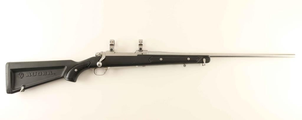Stainless steel bolt-action sporting rifle chambered in 7mm Remington Magnum, manufactured circa 1995. Features a brushed finish, 24" tapered barrel with no provisions for sights, factory rings, smooth trigger, three-position safety, internal box magazine with hinged floorplate and factory black Zytel "boat paddle" skeleton stock with removable grooved grip panels, sling swivels & rubber recoil pad. Rifle exhibits moderated handling marks & scratches with a small single small gouge on the barrel. Action is smooth, the bore is excellent and the synthetic stock is near fine. Condition is near NRA Very Good. ***Modern Firearm***