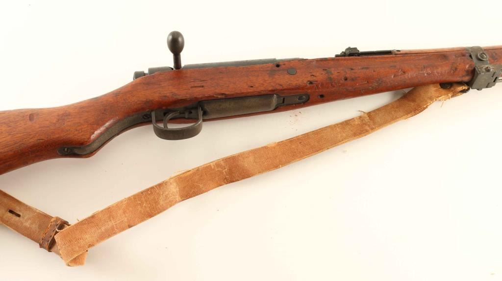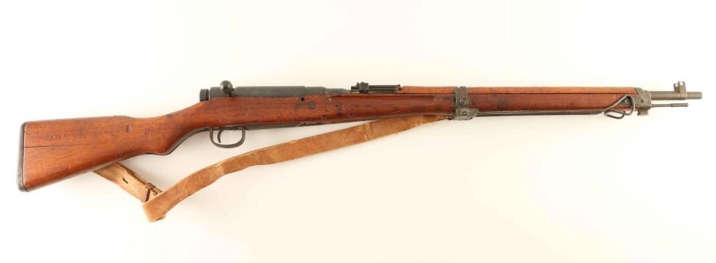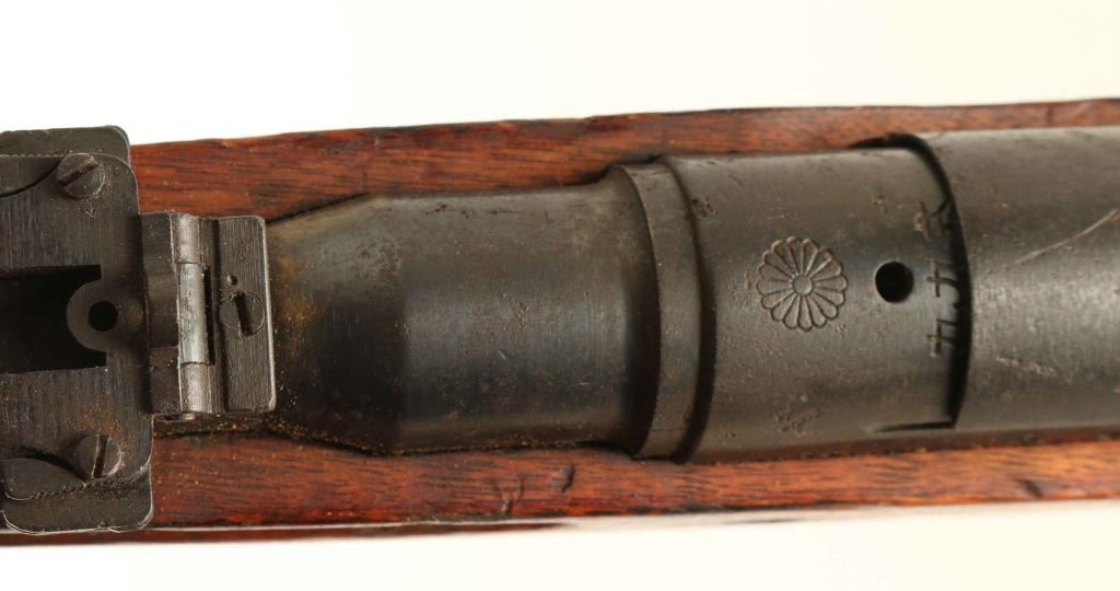 SN: 40054 WWII era Japanese military bolt action short rifle chambered in 7.7mm Japanese, manufactured circa 1943. Features a blued finish, 25.9" barrel, shrouded inverted 'v' front sight, flip-up ladder rear sight graduated to 1,500 meters with folding anti-aircraft leading arms, two barrel bands with bayonet lug on the forward band & folding monopod attached to the rear, cleaning rod, dust cover, straight bolt handle, internal box magazine with hinged floorplate, smooth trigger, knurled cocking piece with safety knob, early receiver marking with mum intact, rubberized canvas sling, smooth wood handguard and pistol grip shoulder stock with finger grooved handguard & smooth metal buttplate. Serial numbers match on the receiver, extractor, bolt handle, dust cover and bayonet lug. Rifle exhibits strong bluing on the top portion from the rear sight to the upper tang with the balance of the metal surfaces displaying a gold patina, all with scattered pitting & dark rust. Action is sound, the bore is very good and the wood stocks are good with a split stemming from the butt. Condition is NRA Fair to Good. ***C&R Firearm***