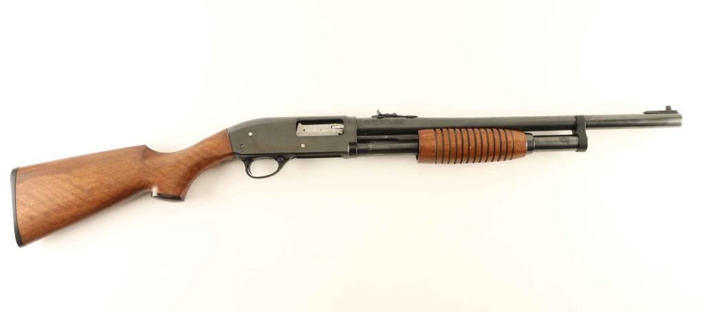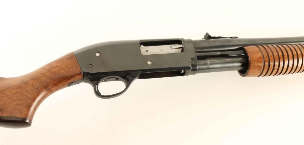 Pump action shotgun. 95% blued finish. wood stock and forearm. 19 1/2" barrel. with rifle sights. Bore appears very good/shiny, but dirty. Blued finish has faded on the tubular magazine, and forearm guides. Some minor scratches on the receiver. Wood is good overall except for a number of scratches to the left side of stock. Action is tight. NRA condition-Very good. Modern firearm.