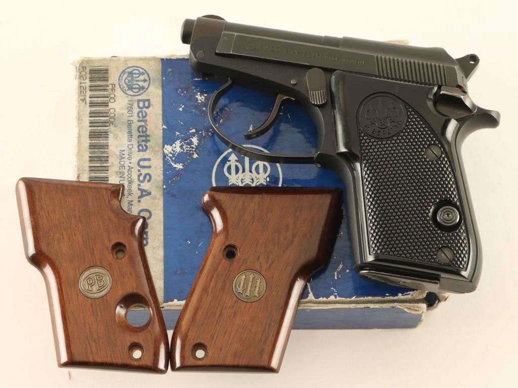 American made double-action semi automatic pocket pistol chambered in .22 Long Rifle. Features a blued/black finish, 2.4" tip-up barrel, fixed sights, smooth trigger, serrated round hammer spur, thumb safety on the left side of the frame, push button magazine release, factory 8 round magazine, alloy frame and two-piece checkered black plastic grips with Beretta insignias. Includes the original factory two-piece cardboard box with documents and a set of smooth wood grips with brass medallions. Pistol exhibits approximately 95% of it's original finish showing high point edge wear. Action is smooth, the bore is excellent and the plastic grips are very good. Condition is near NRA Excellent in box. ***Modern Firearm***