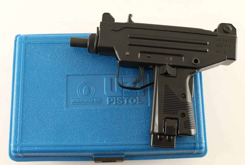 'Pre-ban' Semi-automatic closed bolt pistol variant of the Uzi submachine gun chambered in 9x19mm, manufactures by Israeli Military Industries. Imported by Action Arms LTD of Philadelphia, PA with import marks on the right side of the receiver. Features a matte black finish, 4.5" barrel, shrouded adjustable three-dot sights, smooth trigger, telescoping bolt, manual safety on the left side of the frame, grip safety, magazine release on the left side of the pistol grip, factory 20 round magazine, stamped metal receiver and two-piece grooved black synthetic grips. Includes a factory hard case with manual and tool. Pistol exhibits approximately 99% of it's original matte black finish with only minor scuffs observed. Action is strong, bore is pristine and synthetic grips are fine. Condition is like NRA Perfect in case. ***Modern Firearm***