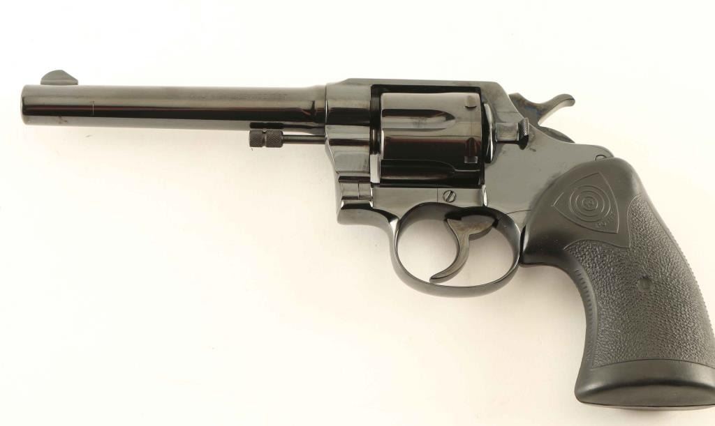Scarce 1917 vintage large frame double-action revolver with "NY ST No 36" engraved on the backstrap. Featured a polished blued refinish, 6" barrel, blade front sight, square notched rear sight, non-shrouded ejector rod, smooth trigger, knurled hammer spur, fluted six-shot cylinder, provisions for a lanyard ring on the butt, and two-piece Mershon black rubber grips. Revolver exhibits nearly all of it's bright blued finish showing some light scattered scratches and handling marks. Action is crisp with solid lock-up, the bore is excellent, markings are good with the exception of the rampant colt and the rubber grips are very good. Condition is NRA Excellent as refinished. ***C&R Firearm***