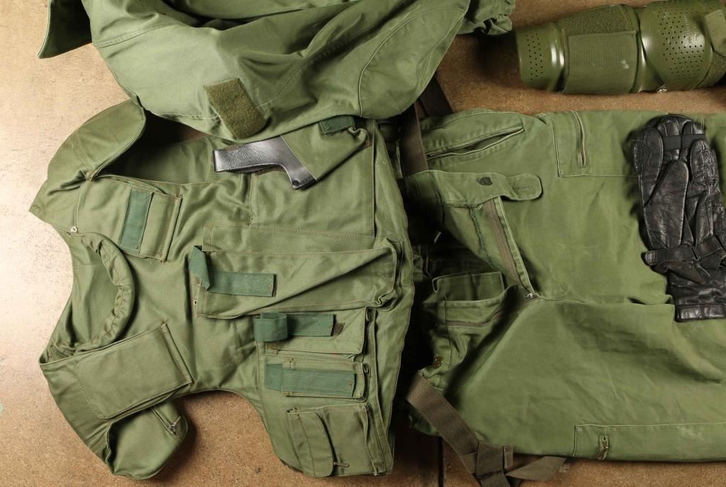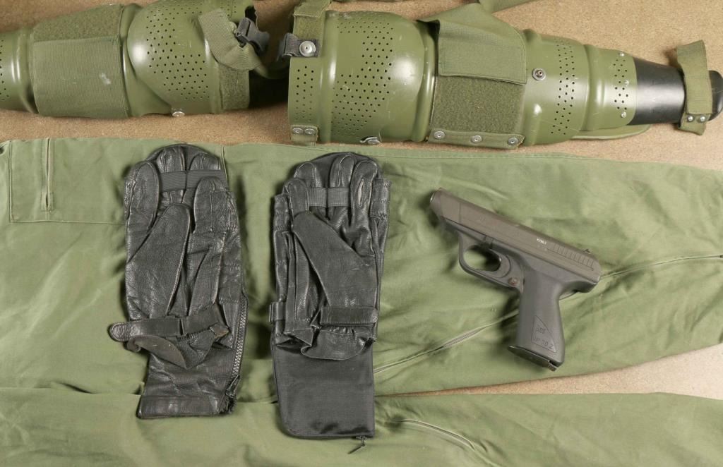 Innovative German made striker fired semi-automatic pistol chambered in 9x19mm, manufactured circa 1981. The VP70(Volks Pistole model 70) was the world’s first production polymer-framed handgun. Imported by HK of Arlington, V.A. with import marks on the right side of the slide. Features a grey phosphate finish on the slide, 4.6" barrel with deep cut rifling, polished ramp front sight with a central channel cut, dovetailed rear sight with square notch, smooth trigger, push button safety, heel magazine release, 18 round magazine and lightly textured black polymer frame. Includes full body German police riot gear consisting of a uniform, armor vest, leg & arm protectors and gloves. Pistol exhibits exhibits approximately 60% of it's original finish showing light wear and scattered light surface rust throughout. Action is strong, the bore is pristine and the polymer is fine. Condition is NRA Good. ***Modern Firearm***