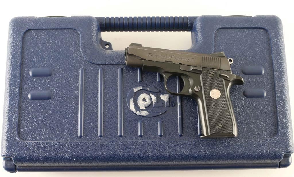 '06880' Lightweight single action semi-automatic pocket pistol chambered in .380 Auto, manufactured circa 1997. Features a blued slide, 3.25" barrel, dovetailed front sight with red painted accent, Novak's low mount style rear sight with set screw, serrated trigger, serrated round hammer spur, manual safety on the left side of the frame, matte black finished alloy frame, push button magazine release, factory 7 round magazine, and two-piece checkered black synthetic grips with silver Colt medallions. Includes the original factory hard case with documents, hang tag and chamber flag. Pistol exhibits approximately 95% of it's original finish showing light holster wear and a couple small bright scratches on the front strap. Action is smooth, the bore is pristine and the synthetic grips are near fine. Condition is NRA Very Good++ in case. ***Modern Firearm***