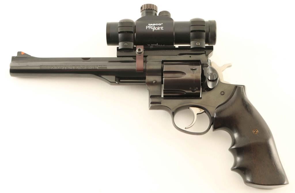 Large frame double action revolver chambered in .44 Magnum, manufactured circa 1989. Features a blued finish, 7 1/2" ribbed barrel with integral scope base cuts, dovetailed serrated ramp front sight with orange insert, removed rear sight, installed B-Square optic rail with Tasco Pro Point red dot sight, smooth trigger, knurled hammer spur, transfer bar safety, fluted six-shot cylinder, shrouded ejector rod, and Eagle Grips two-piece smooth wood wrap-around finger groove grips. Revolver exhibits approximately 97% of it's original finish with light muzzle wear, scattered handling marks/blemishes and the cylinder turned plum showing a light drag line. Action is smooth with good lock-up, the bore is excellent, the optic does not turn on, and the custom wood grips are very good. Condition is near NRA Excellent. ***Modern Firearm***