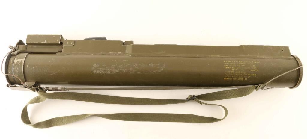 US M72A2 Law rocket Tube,Inert/display. (Lightweight Anti-armor Weapon) Shoulder fired. The launcher, fires a 66mm HEAT warhead. Consists of two tubes. The outer tube has the trigger assembly,, trigger arming handle, and the front, and rear pop-up sights. Law is complete with firing instructions label, military nomenclature printed on the side,green nylon sling. INERT TNG ONLY stenciled on the side. Black rubber trigger cover is ripped..Great display item.