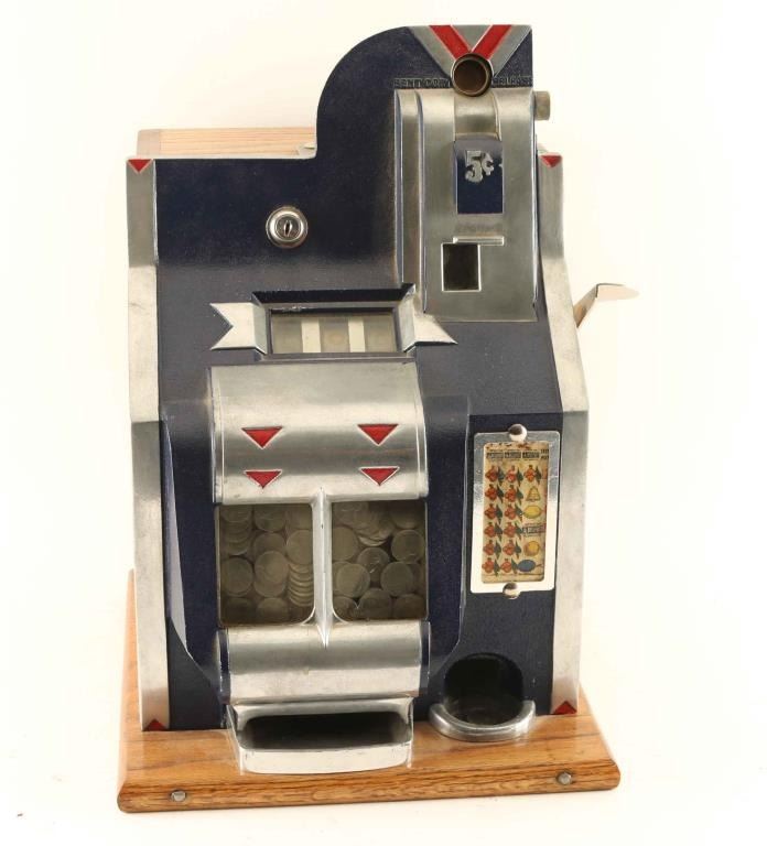 Blue painted and nickel, three fruit machine with oak base and sides. Includes key
