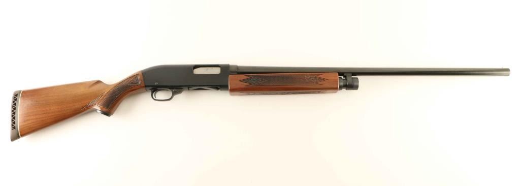 Trade name slide action repeating shotgun chambered for 2 3/4" 12 gauge shells, manufactured by Winchester as a slightly modified version of their Model 1200. Features a blued 28" full choke barrel, half-length tube magazine, brass bead front sight, smooth trigger with beveled edges, push button safety, black finished alloy receiver, press checkered wood slide handle and pistol grip shoulder stock with metal grip cap, factory recoil pad & 14" LOP. Shotgun retains approximately 98% of it's original finish showing very little wear. Action is smooth, the bore appears very good but dirty and the wood stocks are near fine. Condition is NRA Excellent. ***Modern Firearm***