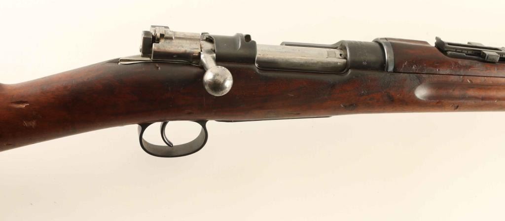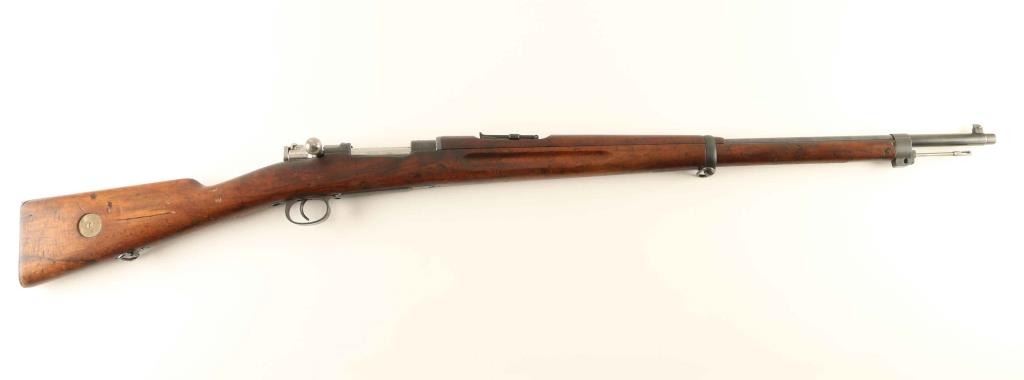 Swedish Military bolt action mauser rifle chambered in 6.5x55mm Swedish, manufactured circa 1902. Imported by IA Co of Sacramento, C.A. with small import marks on the right side of the barrel. Features a blued finish, 29 3/8" threaded barrel with thread protector, dovetailed patridge front sight, ladder style rear sight graduated rear sight to 2,000 meters, cleaning rod, smooth trigger, internal 5 round box magazine, integral stripper clip guide cut into the receiver, straight bolt handle, three-position manual safety on the rear of the bolt, smooth wood handguard and straight grip shoulder stock with finger grooved forend, brass stock disc & smooth metal buttplate. Serial numbers match on the receiver, bolt(in four places), bolt release, floorplate, and buttplate. The stock disk is marked 6.50" bore diameter, #3 bore condition and 0 holdover. Rifle retains approximately 90% of it's blued finish showing thinning and light wear. Action is smooth, the bore is excellent and the wood stocks are good with many blemishes. Condition is NRA Very Good++. ***C&R Firearm***