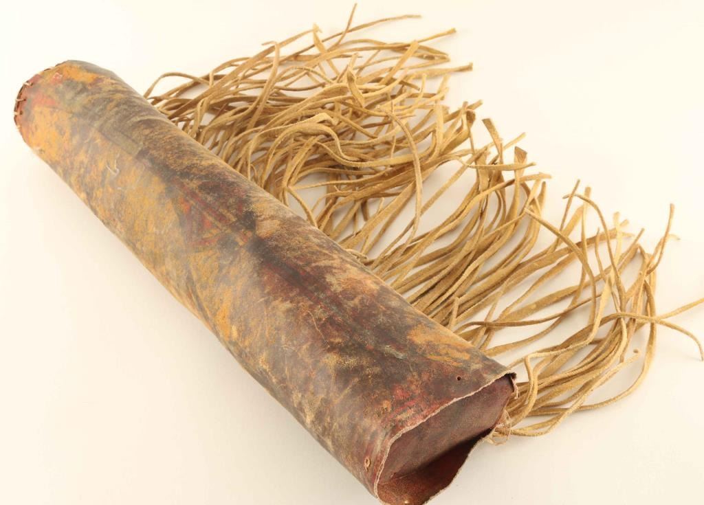 Parfleche cylinder with fringe with painted geometric design still visible