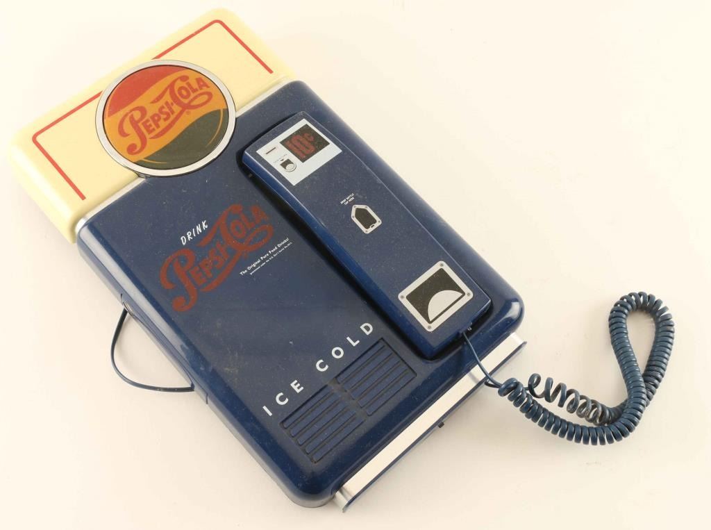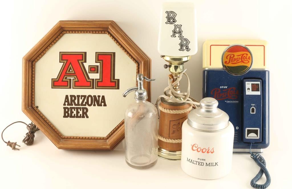 Including; 'A-1 Arizona Beer' advertiser light, Schlitz "Bar" light with wooden mug and rope handle motif base, 'Frank Banko Bottler, Bethlehem PA, Southside, Contents 26 Ounces' seltzer bottle, 'Coors Malted Milk' ceramic canister, and a phone in the guise of a Pepsi vending machine.