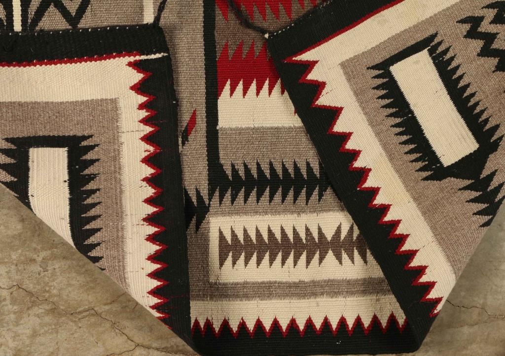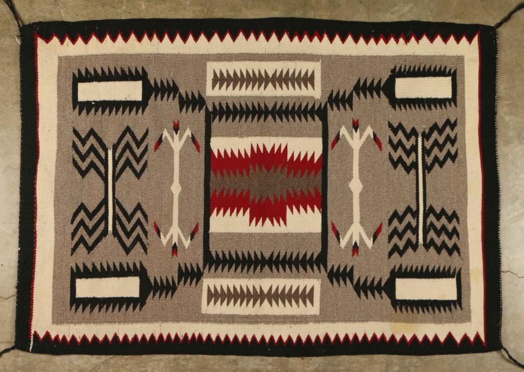Red, black and white rug in storm pattern with corn symbols. Some stains otherwise good, measures 39"x27".