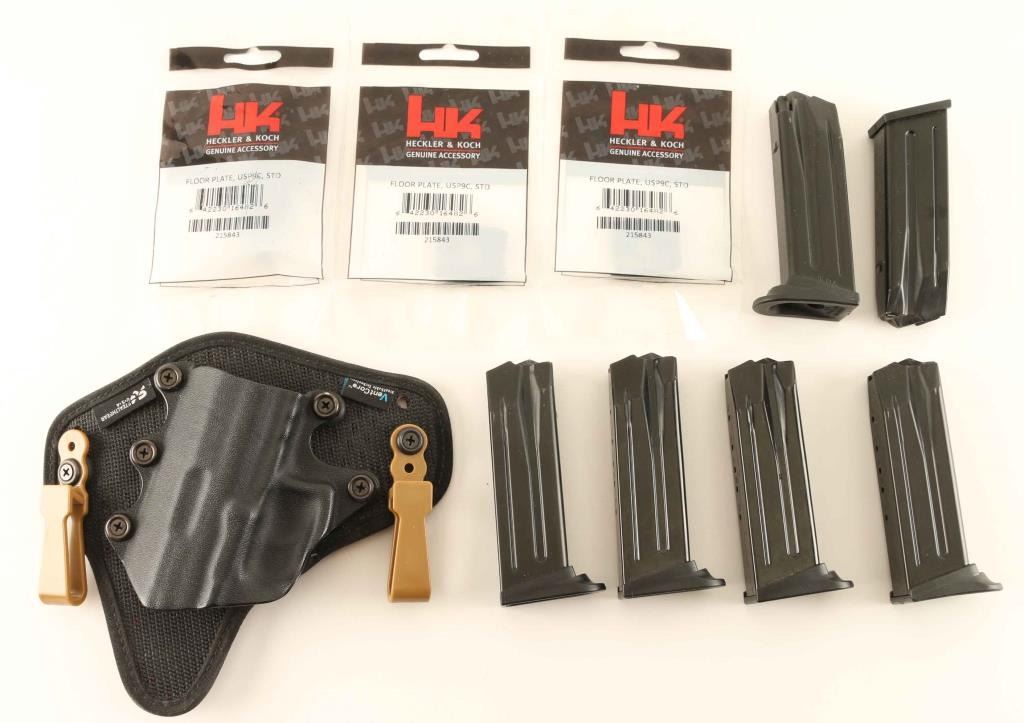 Includes 6, 13 round 9mm mags for HK pistol, 3 floor plates for HK mags and a holster.