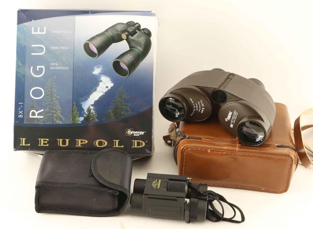 Leupold Rogue BX-1, 8x50 armored and waterproof with case in original box, small pair of Bushnell 8x22 compact binoculars and a vintage pair of Focal 7x35 Eww made in Germay for S.S. Kresge Company, Detroit, Michigan in case. All in very good condition
