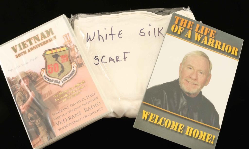 "The Life of a Warrior, Welcome Home!' autographed book, "Vietnam 50th Anniversary DVD and a white silk scarf.