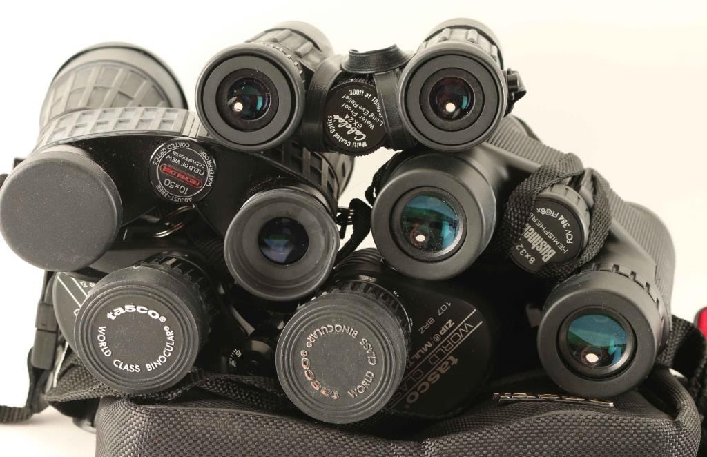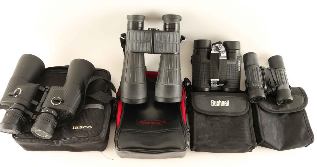 Including; Tasco World Class 8x-24x50 Triple Zoom, Redfield 10x50, Bushnell Hemisphere 8x32, and a pair of Cabela's 8x24. All in cases, good condition.