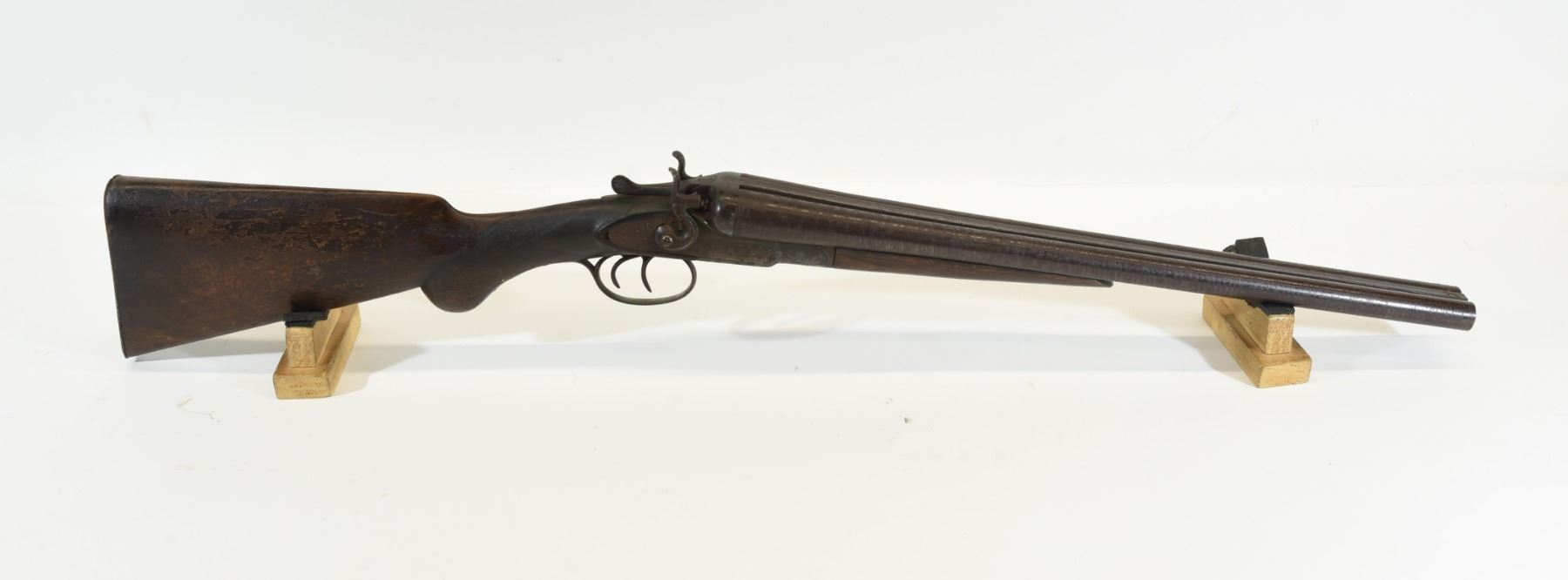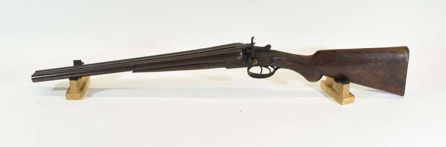 Non-restricted, multi barrel, 12Ga, 19 1/2" laminated barrels, SN none. Wood has large chunks missing behind receiver, bluing is brown with lots of pitting, bores pitted.