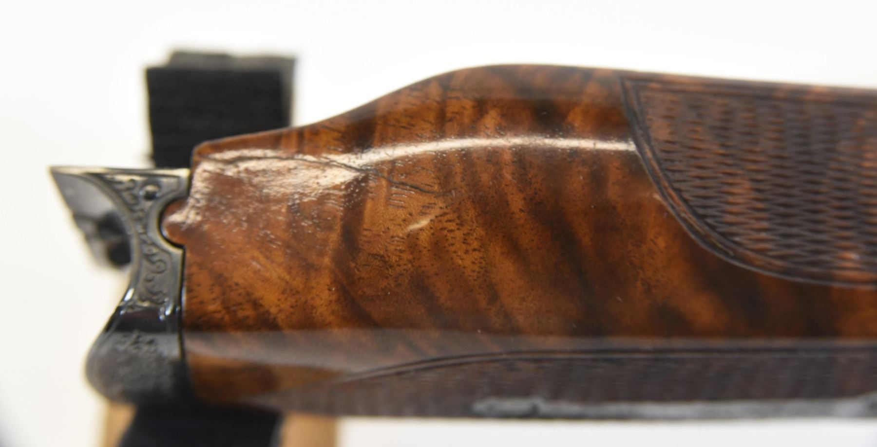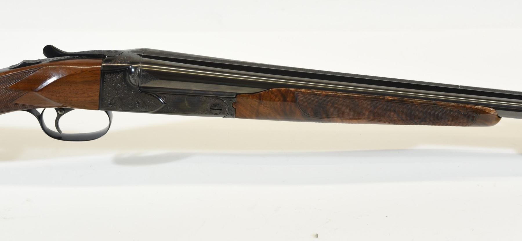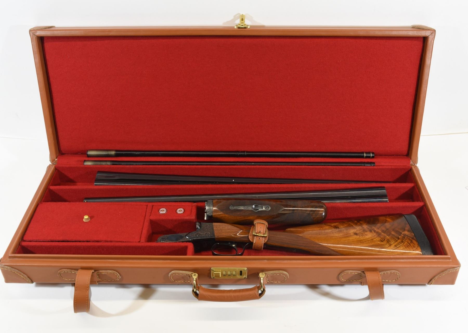 Non-restricted, multi barrel, 20Ga x 2 3/4", 26" solid rib barrel with fixed skeet chokes and a 28" Atlas Barrel Company (Chicago) vent rib barrel set with fixed chokes (F,M) and a 410 tube set, SN 13439. Excellent overall condition. Fine engraving by Ron Collins, high grade wood. Small repair in forearm. Excellent leather take down case. Rare.
