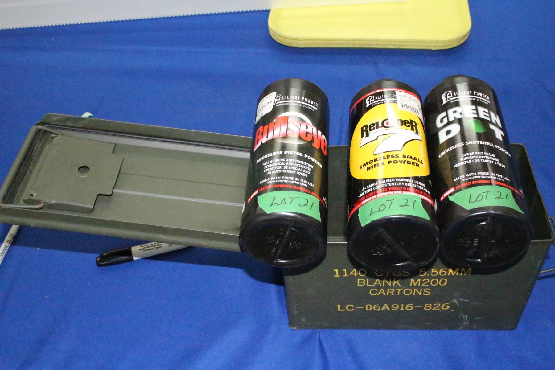 Lot 21 3 Part Containers of Smokeless, Small Rifle, Pistol Powder and Shot Shell Powder in a Military Ammo