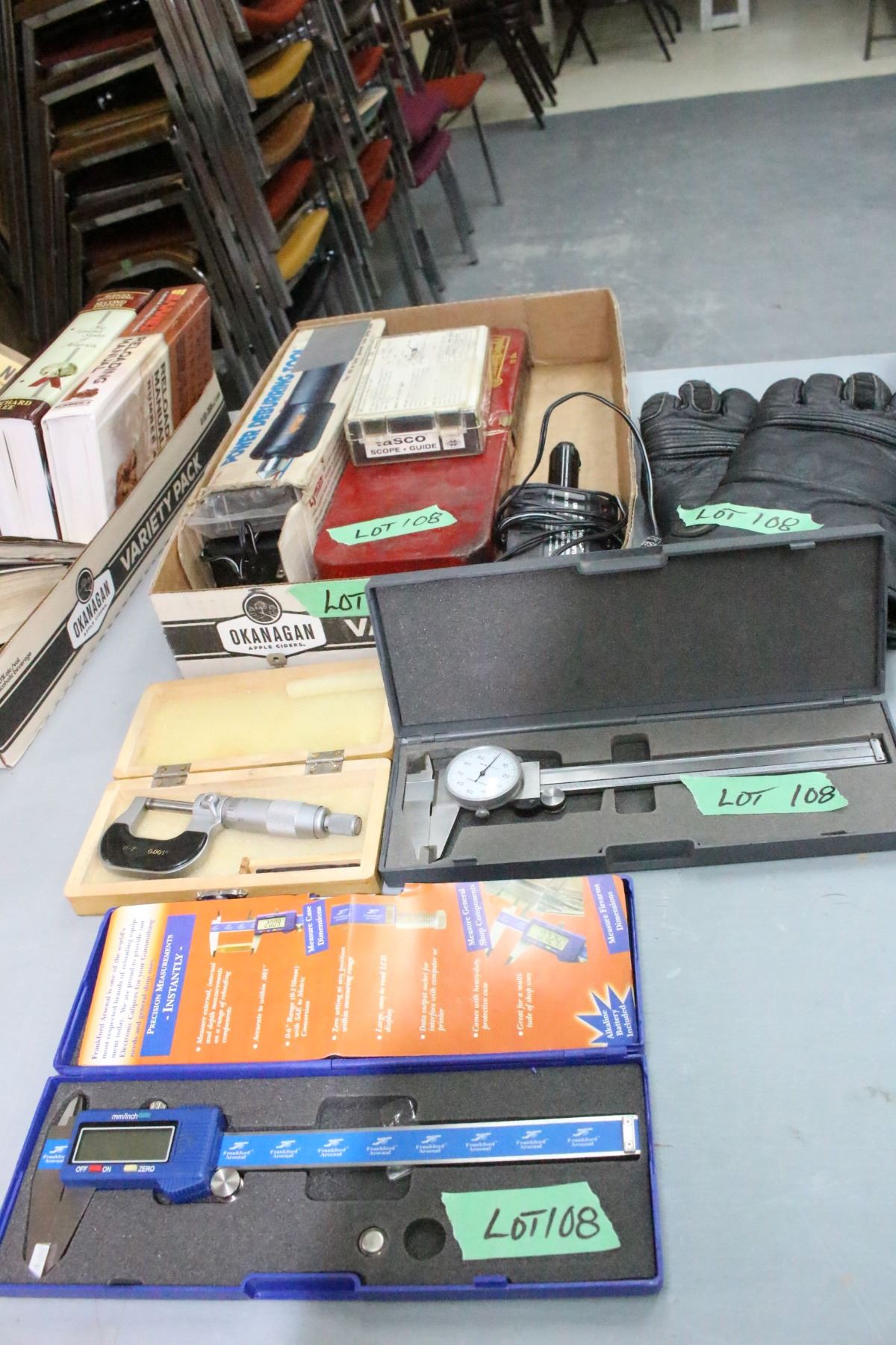 Lot 108 Flat w/Micrometer; Digital Caliper; Manual Caliper; 12 ga. Cleaning Kit; Deburring Tool; Gloves & a