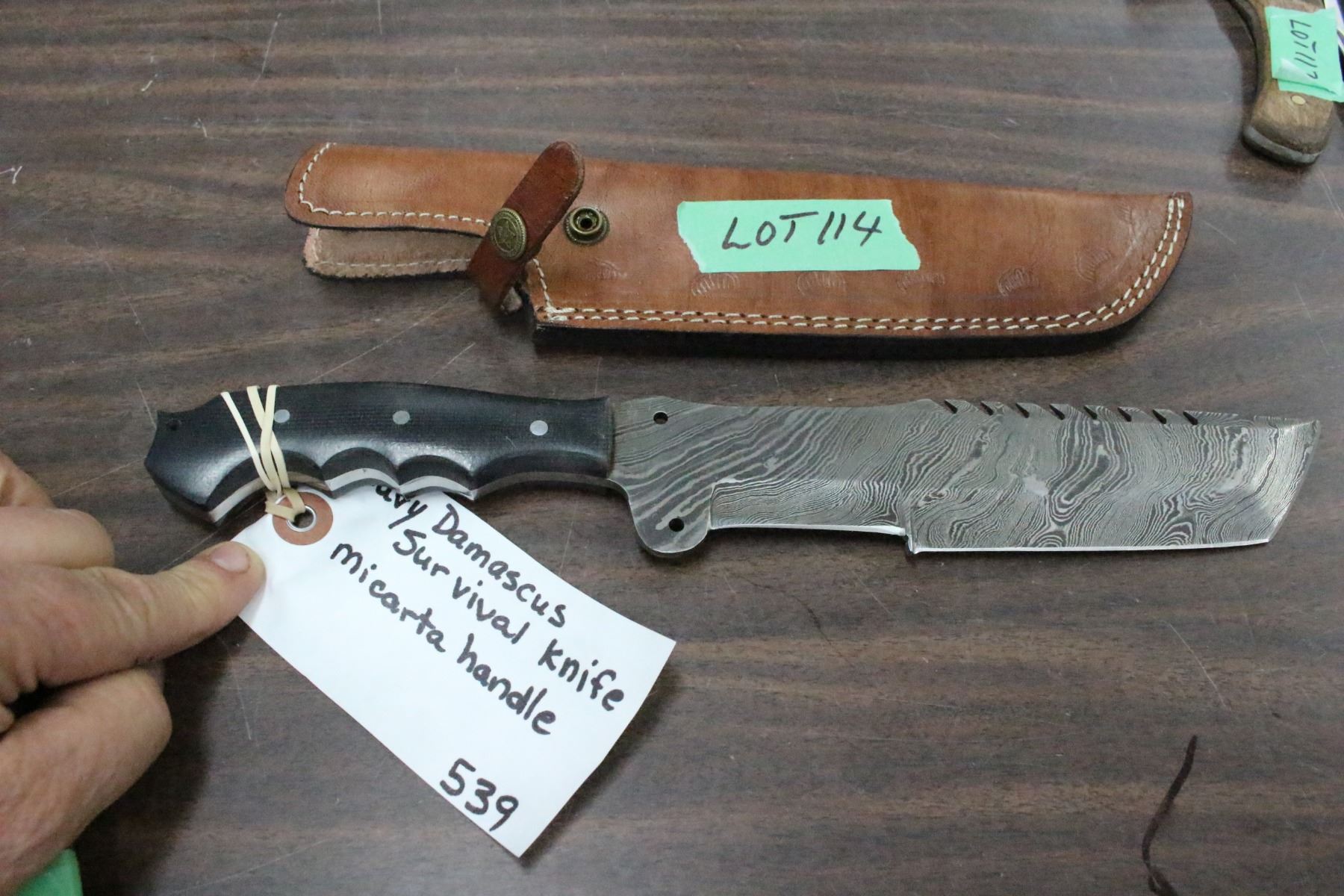 Lot 114 Heavy Damascus Survival Knife w/8" Blade, Micarta Handle and Sheath