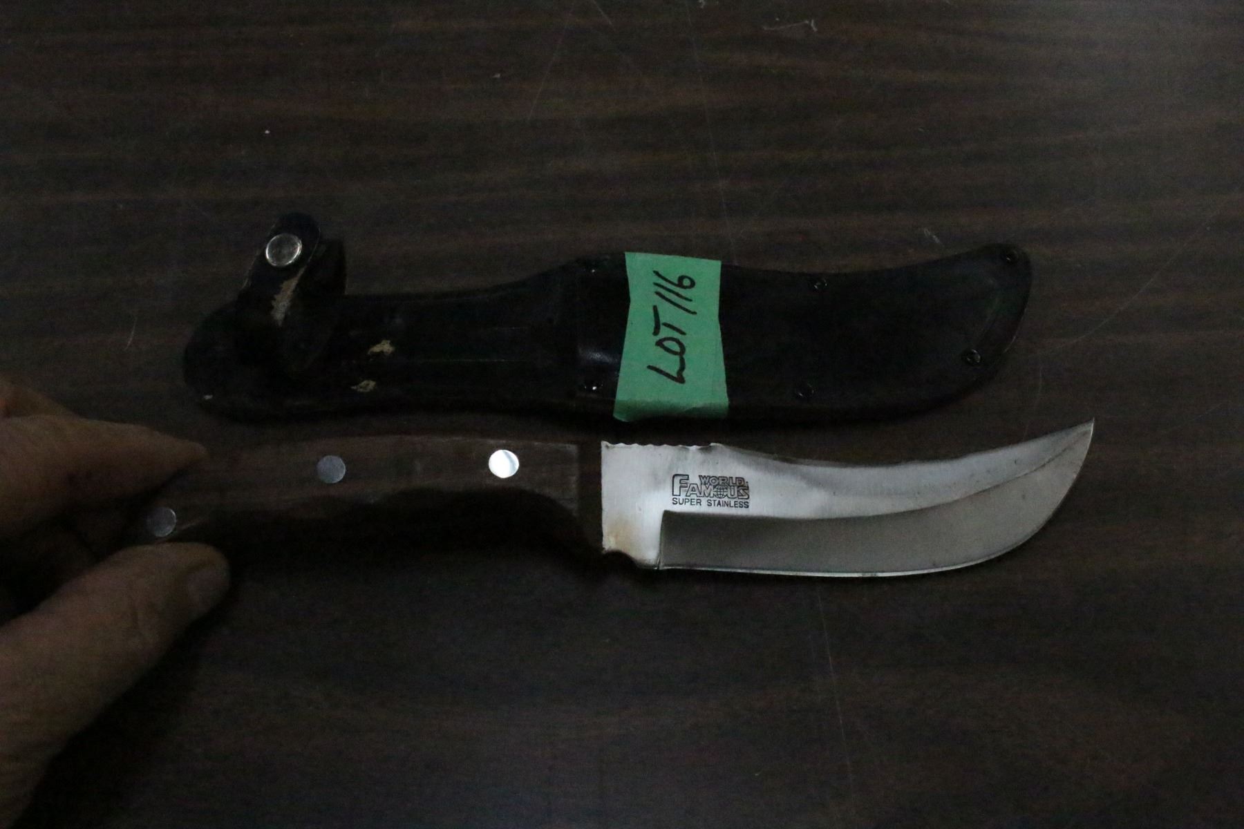 Lot 116 World Famous Stainless Hunting Knife w/5" Blade, Wood Handle & Sheath