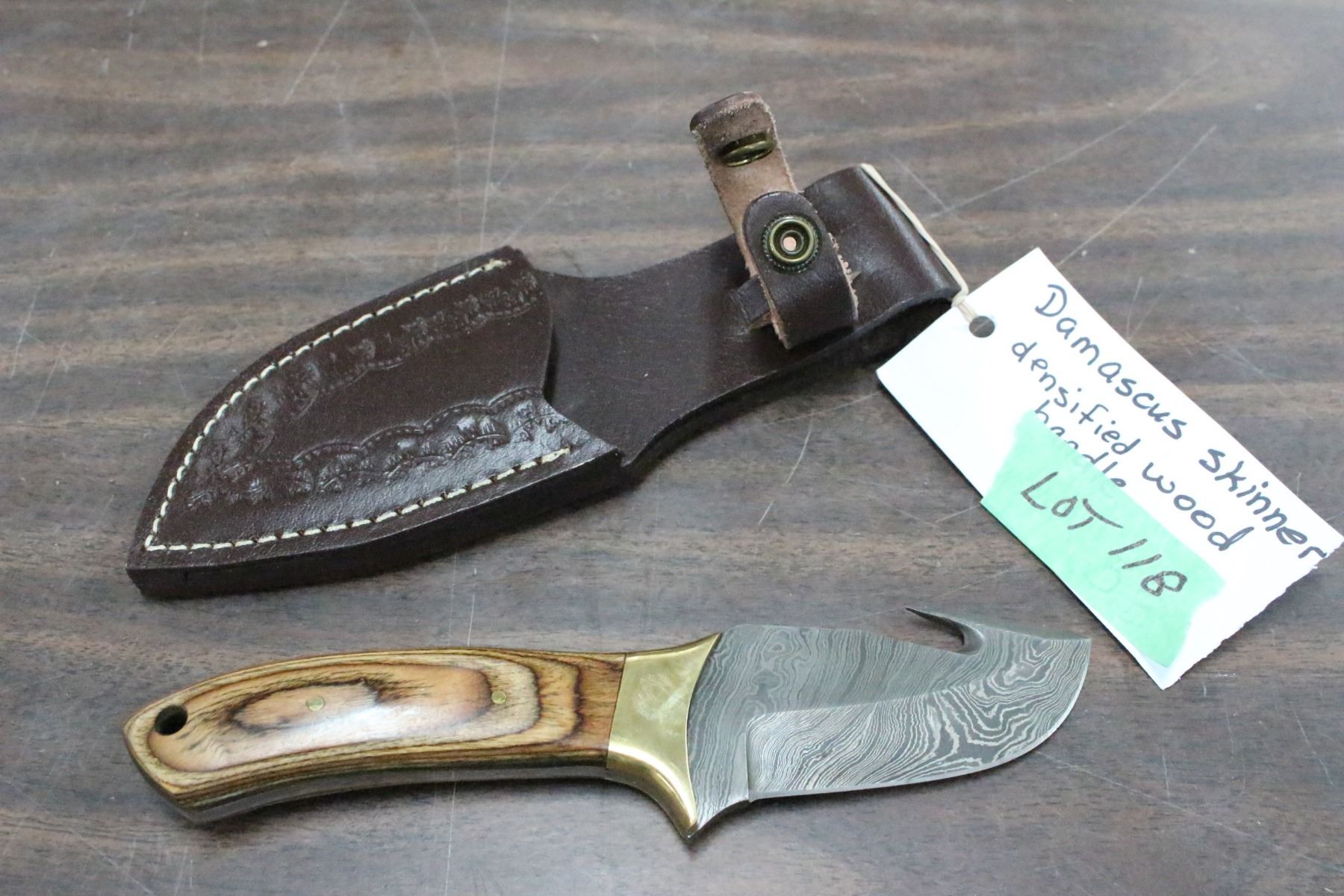 Lot 118 Damascus Skinner w/ 3 1/2" Blade, Densified Wood Handle, Gut Hook & Sheath