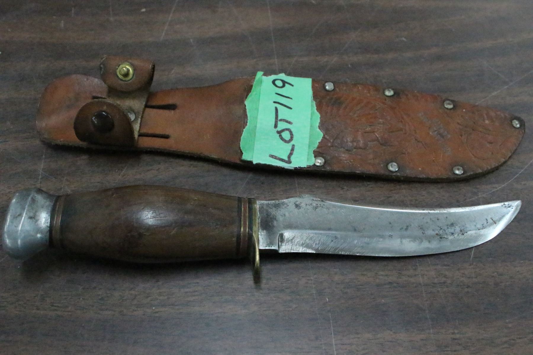 Lot 119 Hunting Knife w/5" Blade, Wood Handle & Sheath - Stamped 'Kirkland Lake Ontario'