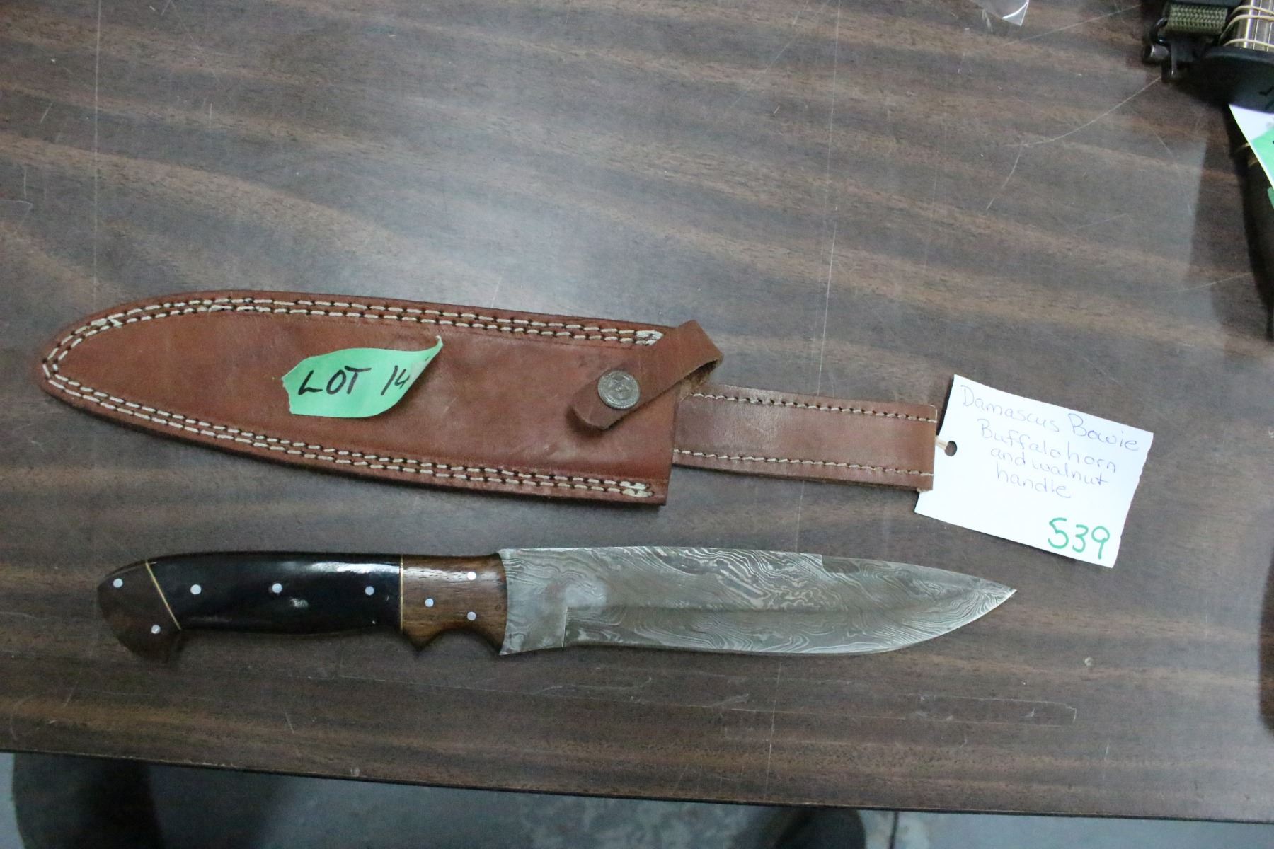 Lot 146 Damascus Bowie Knife w/8" Blade, Buffalo Horn/Walnut Handle & a Sheath