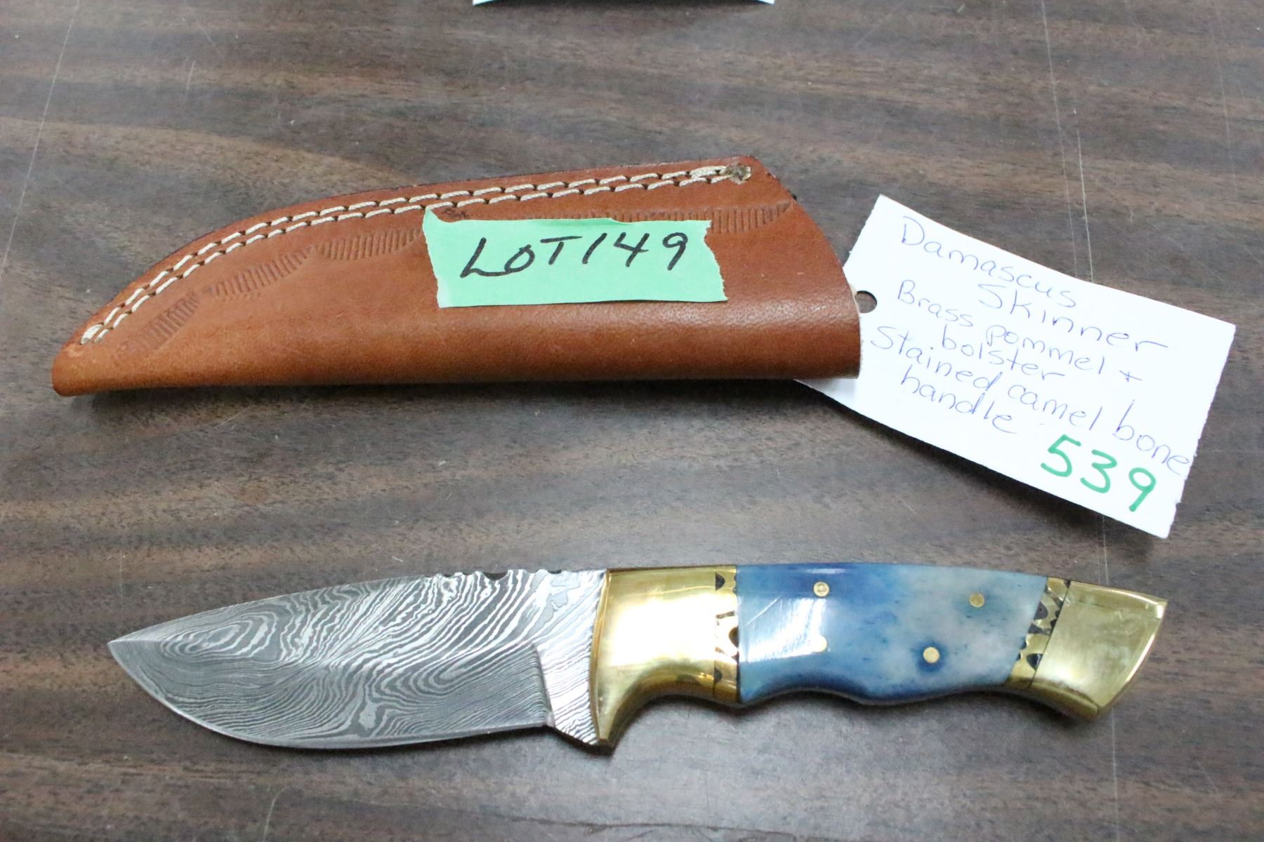Lot 149 Damascus Skinner w/4" Blade, Brass Pommel and Bolster, Stained Camel Bone Handle and Sheath