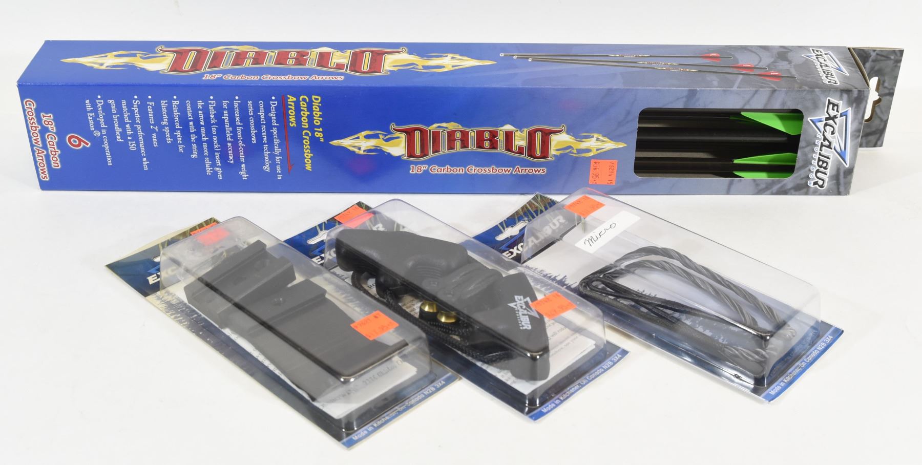 6 18" carbon bolts, cocking aid, dovetail quiver mount, Micro string.