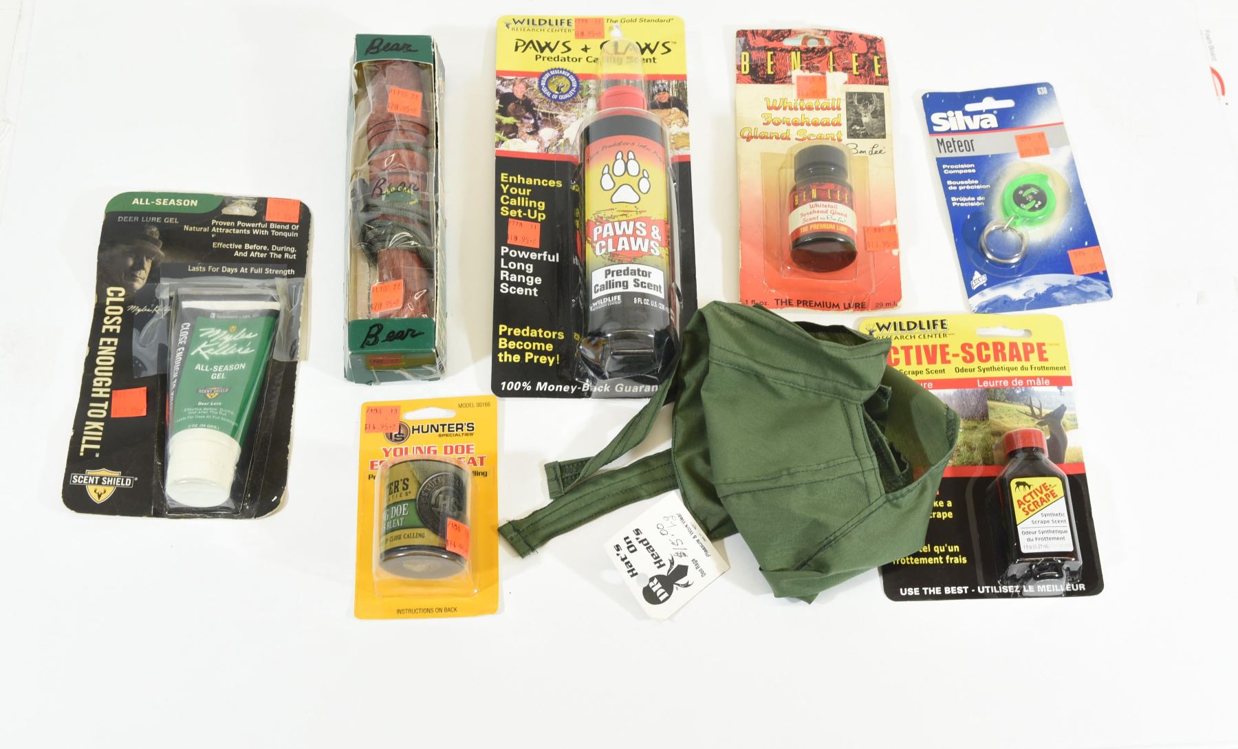 Active Scrape buck lure, bear call, whitetail gland scent, Silva compass, Young Doe bleat, Paws & Claws scent, deer lure gel, doo rag.