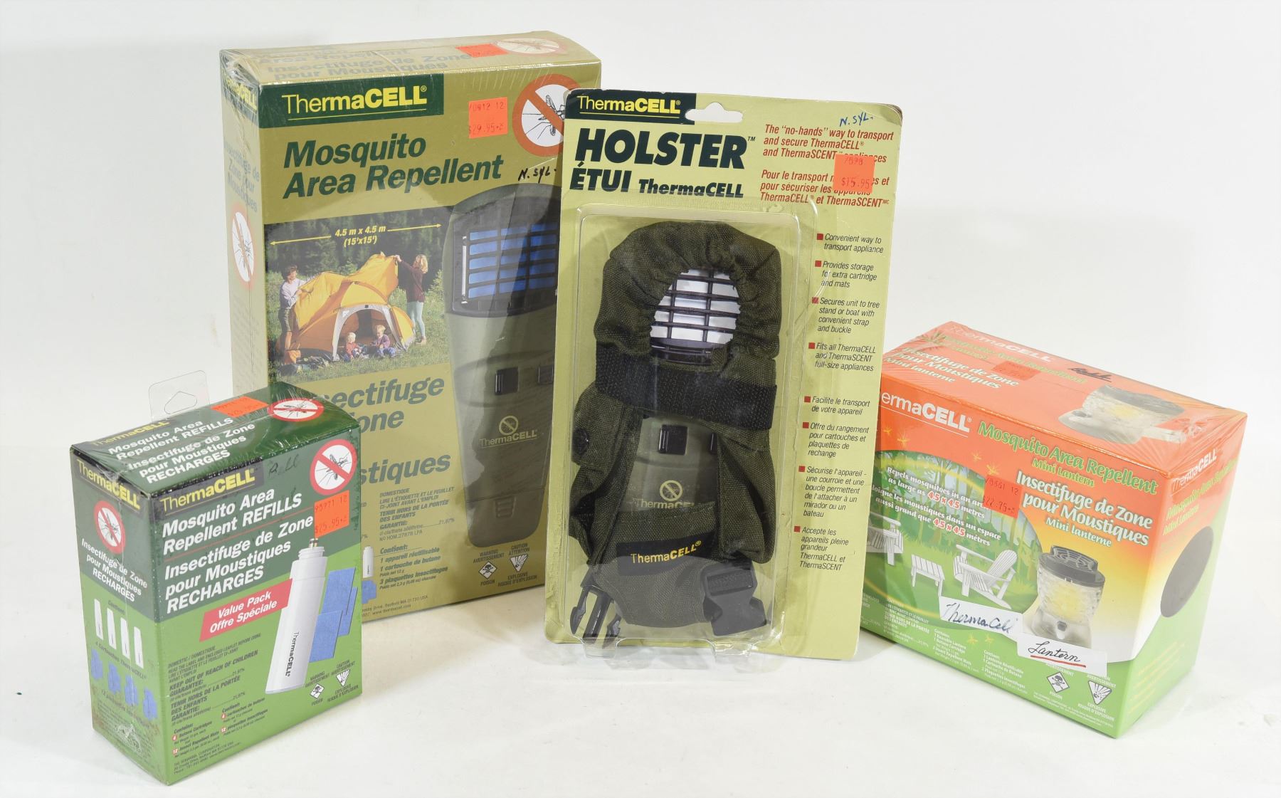 All new in original packaging, cannot ship because of butane cartridges 1) Reusable appliance 2) Holster for the appliance 3) Thermacell lantern 4) 4 Butane cartridges