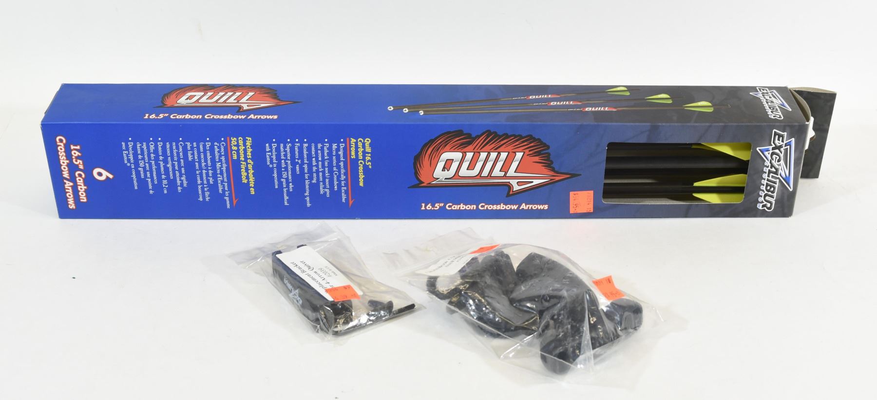 Pack of 6 Excalibur Quill 16.5" carbon fiber bolts, Excalibur replacement bracket for 4-arrow quiver, Excalibur Crossbow cocking aid.