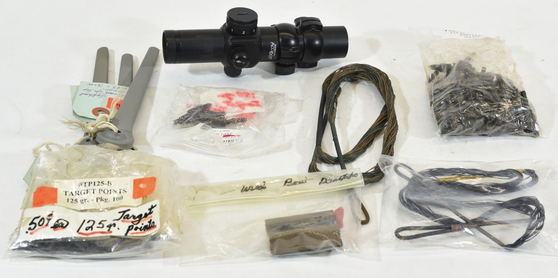 125 grn target points, quiver mount, 35" string, 35 1/2" sring, 3 Skyhook wrenches for lag screws, Tasco Accudot red dot scope.