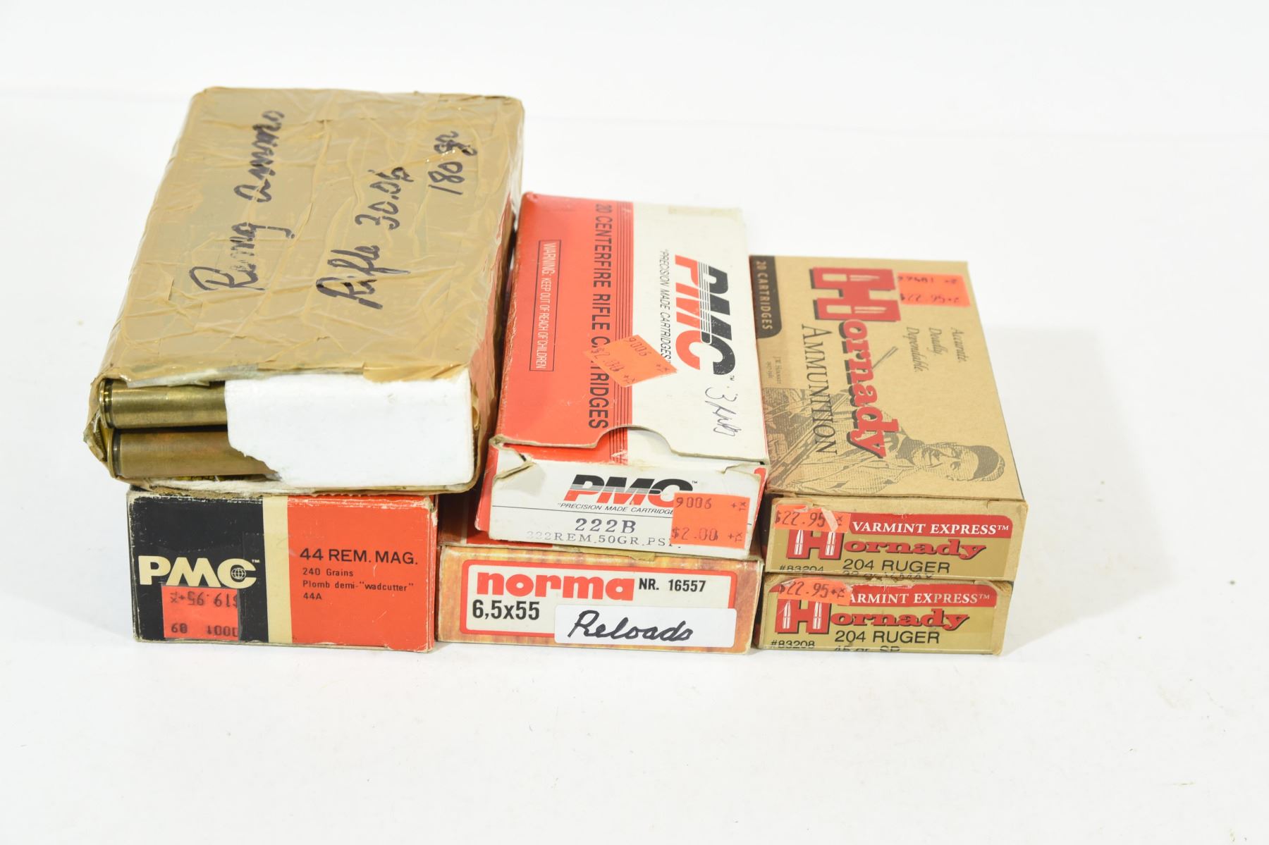 30 Rnds Hornady 204 Ruger, 20 Rnds 6.5 x 55 Reloads, 10 Rnds 30-06 Sprg, 3 Rnds 222 Rem Reloads, 31 Rnds 44 Rem Mag mixed.