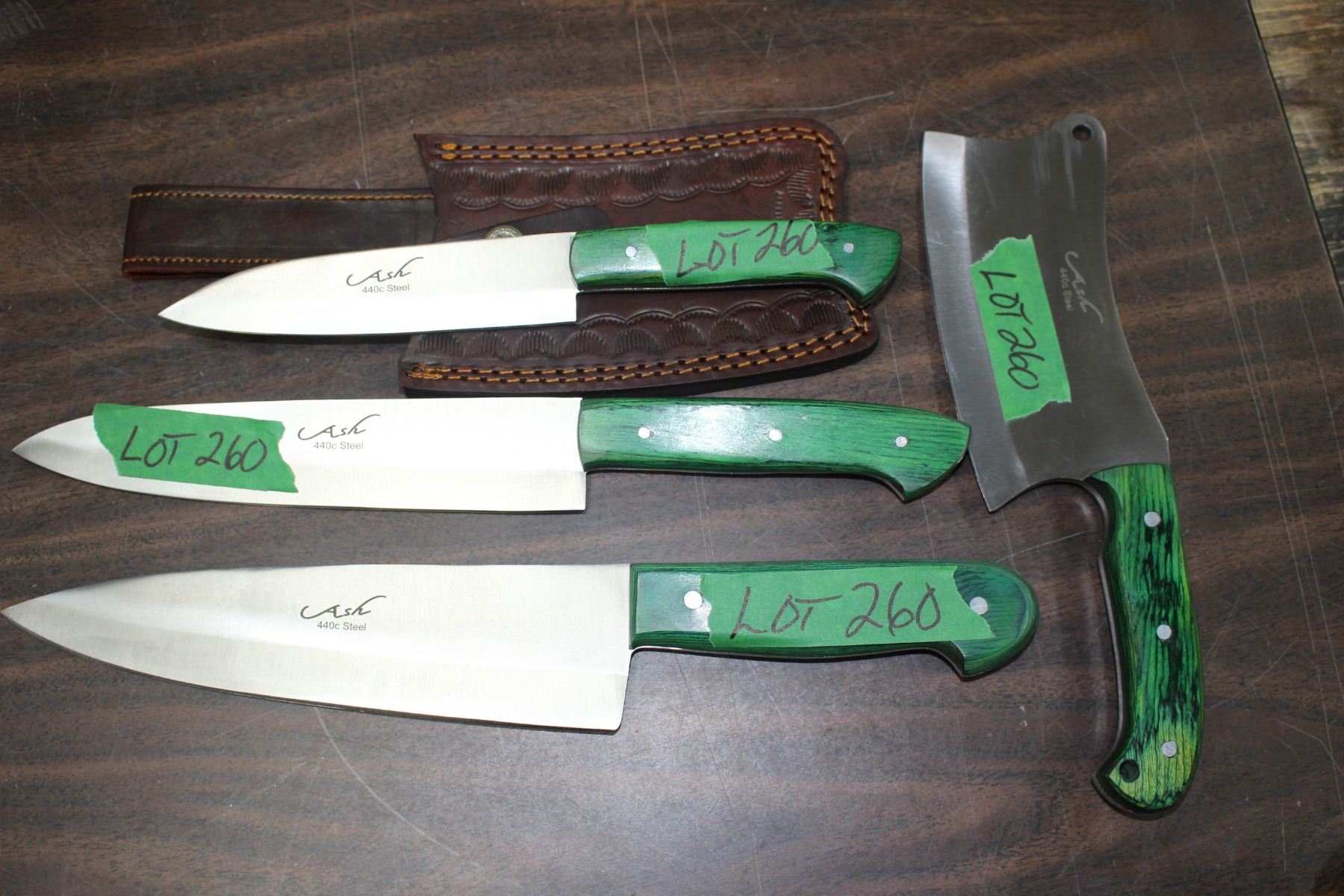 Lot 260 A Set of 3 Ash 440 Steel Kitchen Knives & a Clever