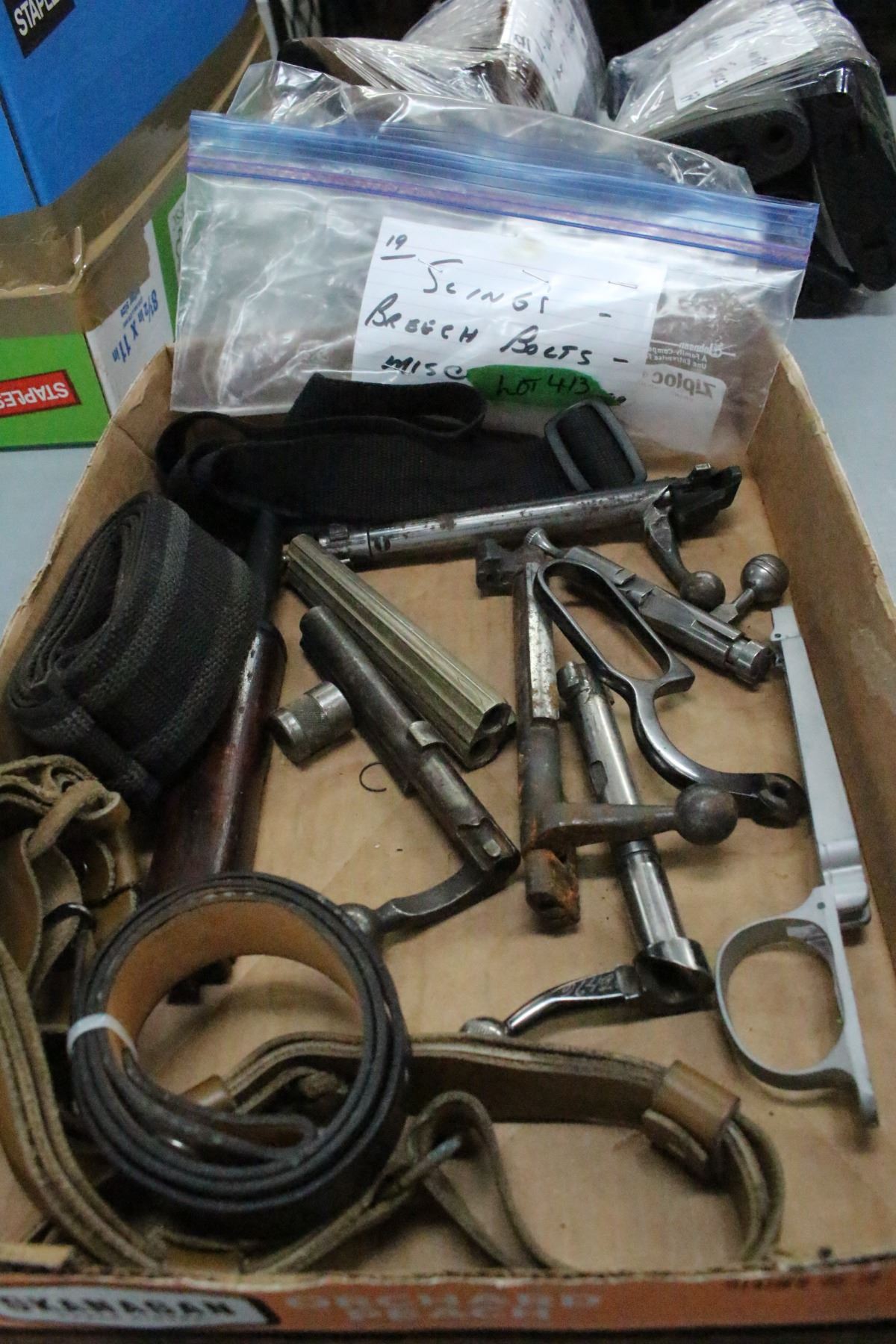 Lot 413 Bag of Breech Bolts; Trigger Guard & Slings