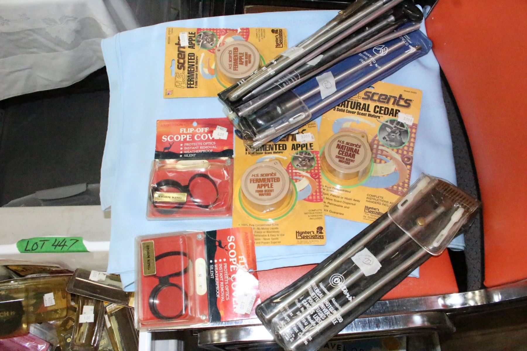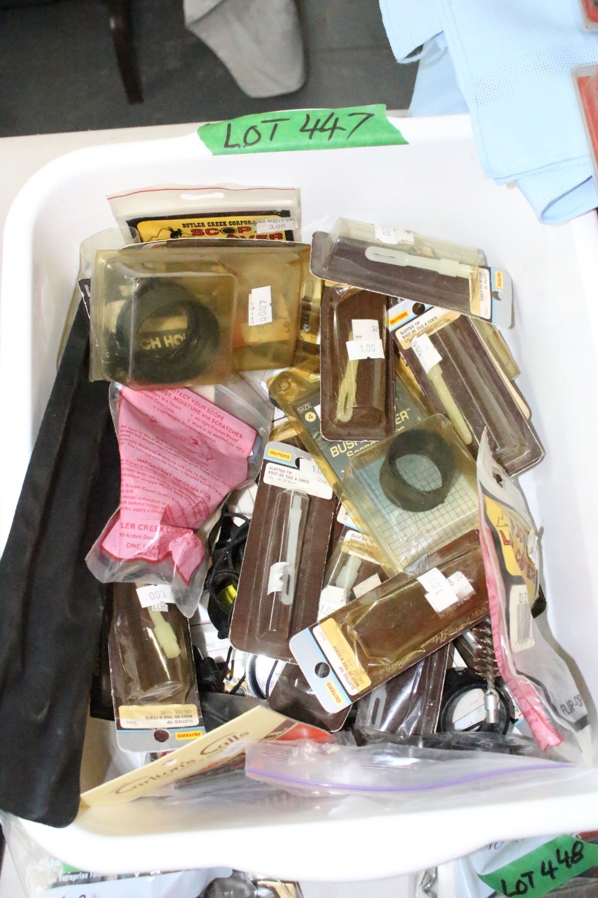 Lot 447 Tub of Firearm's Cleaning Kit pcs.: Rods, Patch Holders, Scope Covers, Brass Brushes & H.S. Scent W